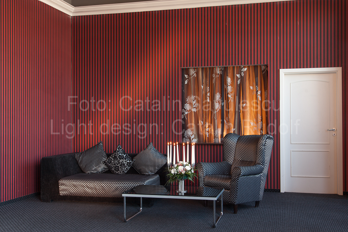 Lumini peste tot, cabluri pe care nu le-am pozat pe perete sau pe covor cu banda adeziva… Inevitabilul se produce si un ospatar mai putin atent a luat un cablu in picioare, cablu, care a antrenat alt cablu si una peste alta au cazut doua lumini cu tot cu stative. Ne-am uitat la ospatar si eu si Cata si ne-a izbit rasul…